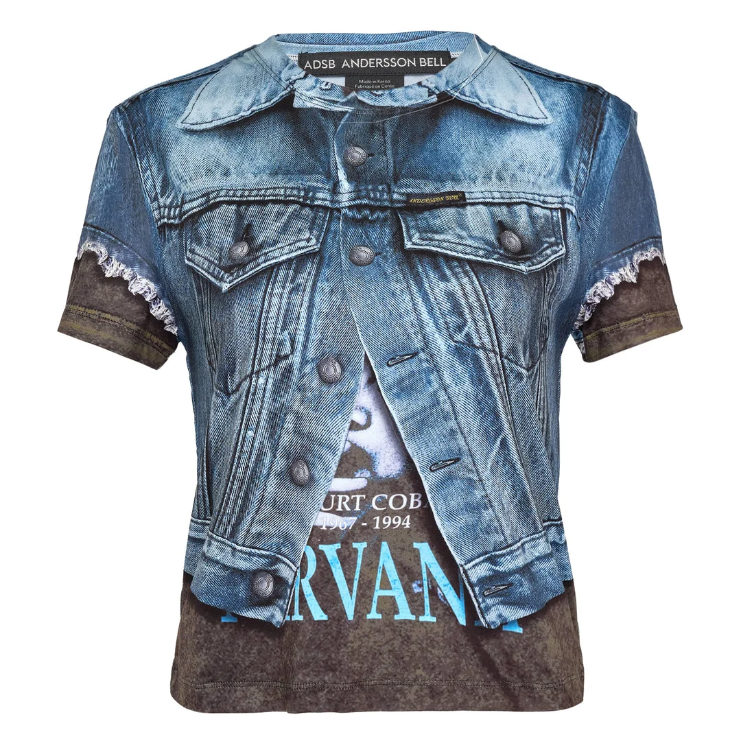 600081370BLU00L / ATB1577W/00/MID BLUE - All-over photorealistic denim vest print - Vintage band graphic detail - Short sleeves with contrast trim - Round neckline - Regular fit - Soft cotton jersey construction The Andersson Bell RVAN Denim Vest Printed T-Shirt delivers contemporary streetwear with photorealistic graphic design. Crafted from soft cotton jersey featuring an all-over denim vest print with distressed detailing and vintage band graphic elements. The innovative trompe-l'oeil effect creates the illusion of layered denim over a band tee for effortless street style.