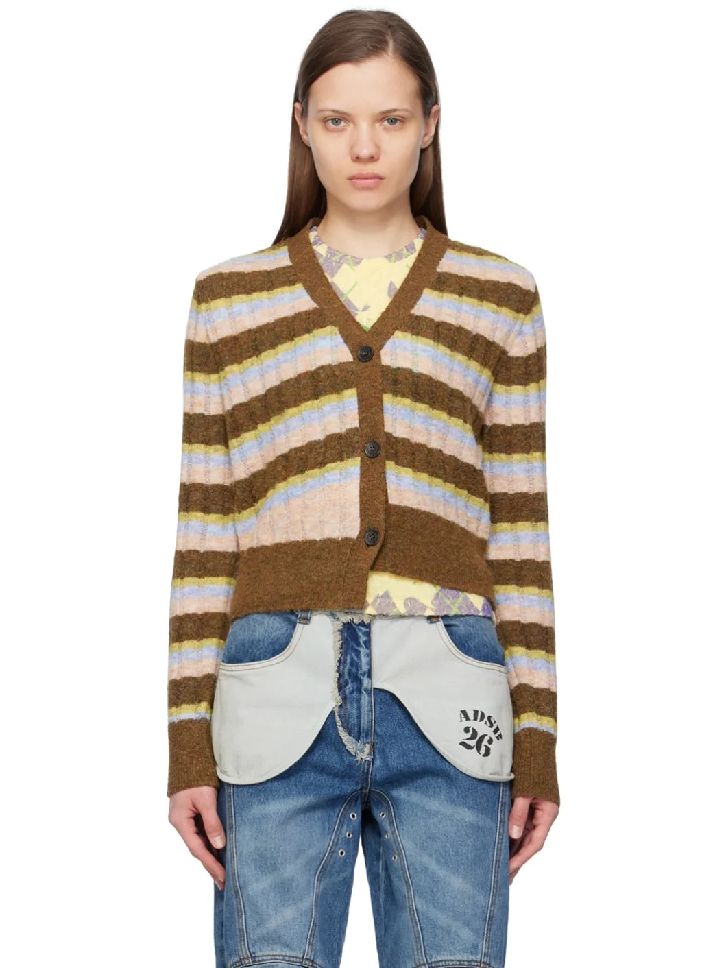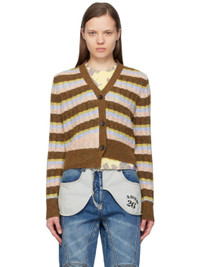 Brushed rib knit stretch polyester-blend cardigan. Stripes throughout. · Asymmetric construction · Y-neck · Button closure · Rib knit hem and cuffs Wholesale exclusivity at SSENSE. Supplier color: Khaki 78% polyester, 10% nylon, 10% wool, 2% spandex. Made in South Korea 241375F099000