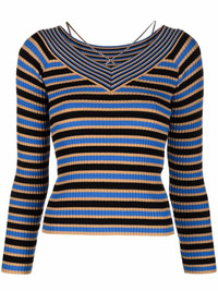 striped rib-knit jumper A striped rib-knit jumper is given a distinctive look by Andersson Bell thanks to thin crossover straps at the neckline. Imported Composition Viscose 62%, AE 38% SIZE & FIT Model measurements Height 5 ft 10 in(1.78 m) Bust/Chest 32.28 in(82 cm) Hips 35.03 in(89 cm) Waist 23.22 in(59 cm) FittingInformation This piece fits true to size. We recommend you get your regular size Cut for a slim fit Made with a mid-weight fabric Measurement BUST 23.62 in(60 cm) Washing instructions Dry Clean Only