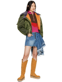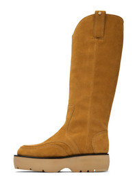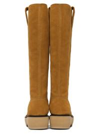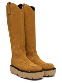 Calf-high suede tall boots in tan. · Square toe · Buffed leather lining in black · Studded detailing in antiqued gold-tone at welt · Treaded EVA foam rubber midsole in beige · Platform: H2 in Supplier color: Tan Upper: leather. Sole: rubber. Made in South Korea 222375F115001