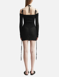 - ANDREĀDAMO - Ribbed Knit Mini Dress - Long sleeves - Self-tie halterneck straps - Thigh-length - Off-shoudlers - Square open-back - Cut-out detailing - Semi-sheer panel design - Lace-detailing - Straight hem - Color: Black - Material: 80% Viscose, 10% Polyester, 9% Polyamide, 1% Elastane - See more Dresses and Clothing SIZING - Model wears size S - Model measures: Height 181cm, Chest 33”/84cm, Waist 24”/61cm, Hip 35”/90cm