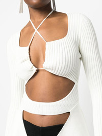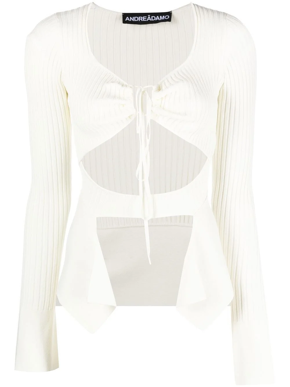 asymmetric cut-out top Andrea Adamo adds a tough-chic attitude to his new collection with this knitwear piece that swoops over the curves of the body, highlighting the neck, waist and hips through cut-out detailing. Highlights - Ivory white - Ribbed knit - Asymmetric design - Cut-out detailing - Draped detailing - Front tie fastening - Sweetheart neck - Long sleeves Made in Italy Composition Viscose 80%, Polyester 10%, Polyamide 9%, Spandex/Elastane 1% SIZE & FIT Model measurements Height 5 ft 11 in(1.8 m) Bust/Chest 31.49 in(80 cm) Hips 36.61 in(93 cm) Waist 24.4 in(62 cm)
