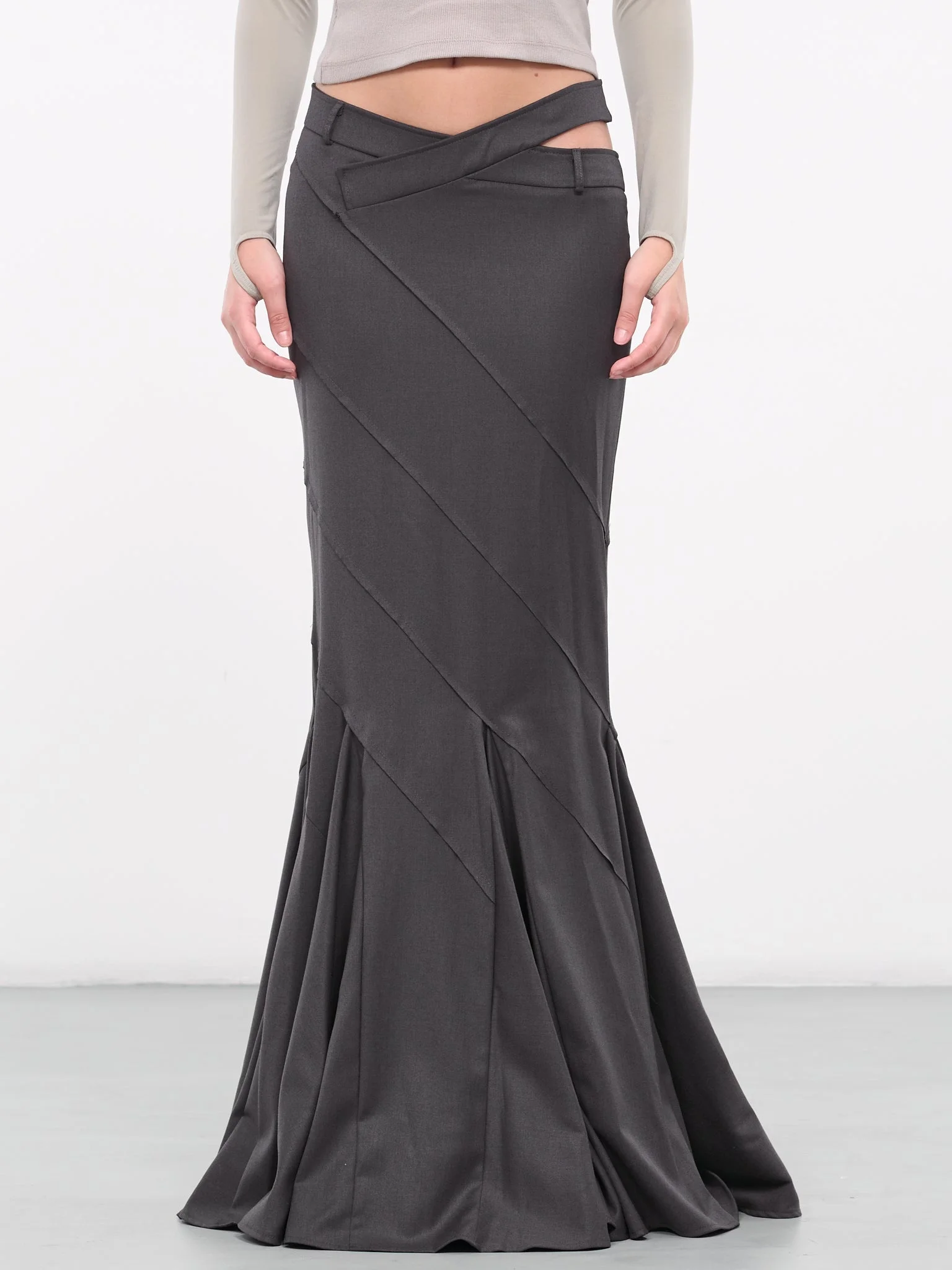 ANDREADAMO gray skirt, mermaid design, paneled construction, mid-waist, hip cut-out, side zip closure, flared hem, maxi length, slim fit. Standard Sizing Model is 5'9" wearing size S. Bust: 32" Waist: 24" Hips: 34"