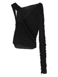 asymmetric ribbed jersey top Highlights - Black - Jersey texture - Fine ribbed - Draped detailing - Twist detailing - Asymmetric neck - Single long sleeve - Asymmetric hem - Cropped Made in Italy Composition Viscose 100% SIZE & FIT FittingInformation Designed for a close fit throughout Cropped in length Made with a fine knit, this piece offers some stretch Washing instructions Machine Wash