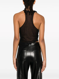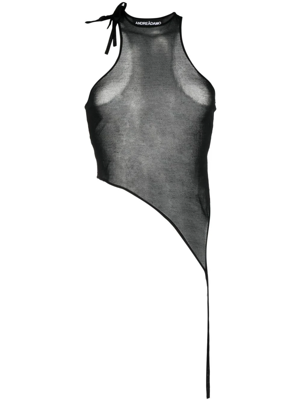 asymmetric sheer tank top Highlights - Black - Modal blend - Sheer - Strap detailing - Round neck - Side tie fastening at the neck - Racerback - Asymmetric hem Made in Italy Composition Modal 71%, Polyamide 16%, Silk 13% SIZE & FIT Model measurements Height 5 ft 10 in(1.77 m) Bust/Chest 31.88 in(81 cm) Hips 36.22 in(92 cm) Waist 24.01 in(61 cm) FittingInformation Designed for a close fit throughout Made from a lightweight non-stretch fabric, this piece offers minimal elasticity when worn This piece fits true to size – take your usual size Washing instructions Hand Wash
