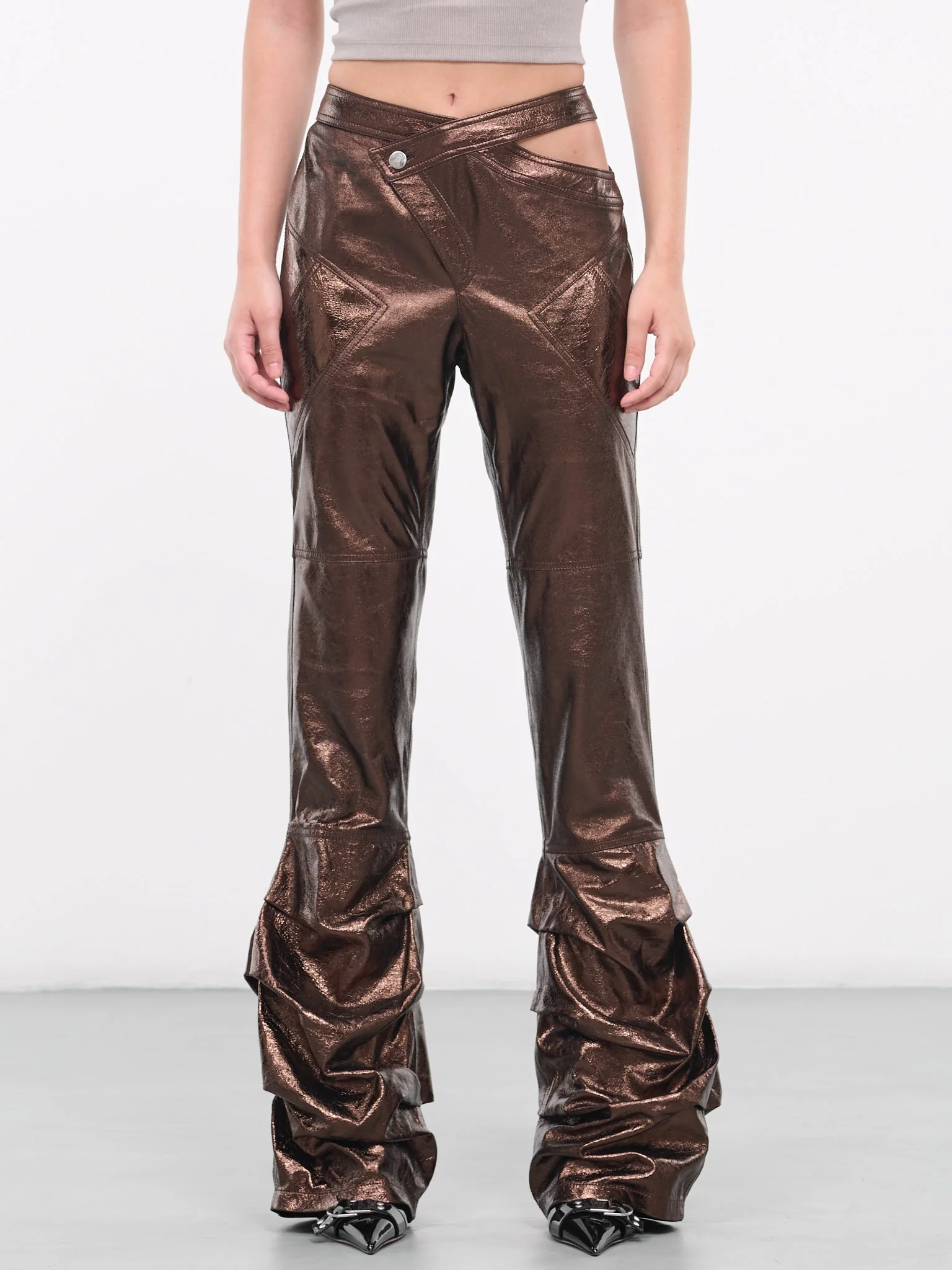 ANDREADAMO brown pants, metallic sheen, mid-waist, hip cut-out, button & zip-fly, four pockets, gathered leg, full length, slim fit. Standard Sizing Model is 5'9" wearing size S. Bust: 32" Waist: 24" Hips: 34"
