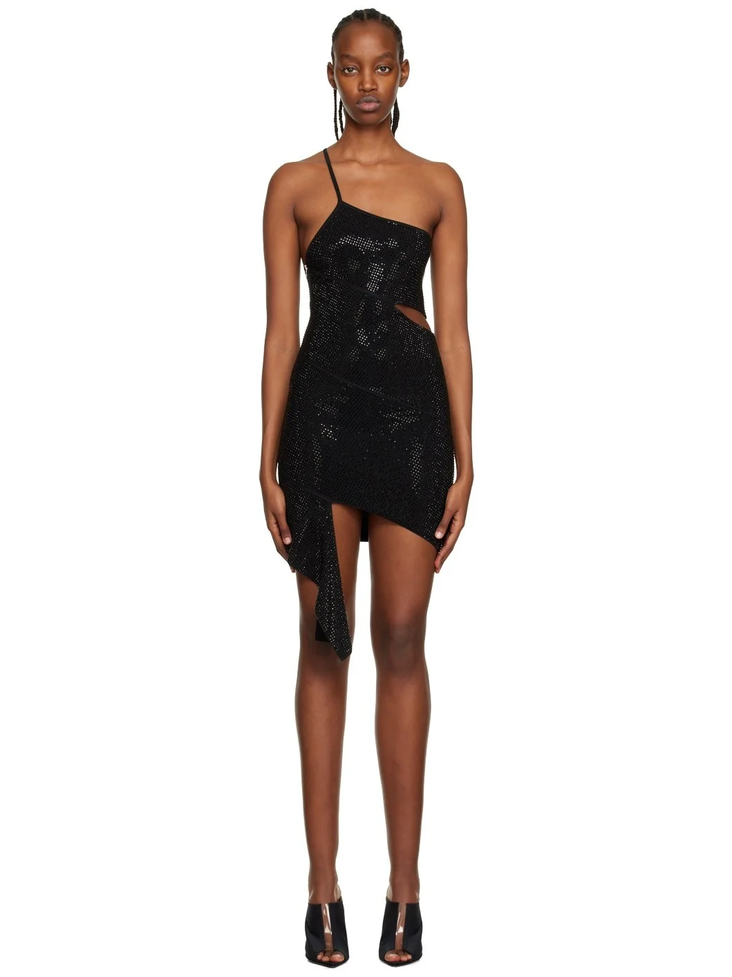 Rib knit viscose-blend dress. Rhinestone detailing throughout. · Single-shoulder construction · Cutout at waist · Extended trim at asymmetric hem · Concealed zip closure at side seam Supplier color: Black