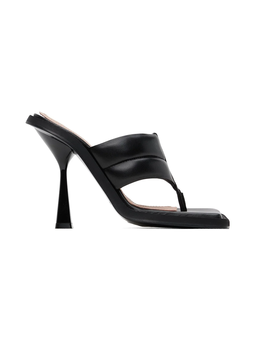 Padded quilted buffed leather slip-on heeled sandals in black. · Open square toe · Padded thong-style strap at vamp · Logo embossed at padded footbed · Covered stiletto heel with rubber injection · Leather sole · Heel: H3.75 in Supplier color: Black Leather. Made in Italy 231753F125000