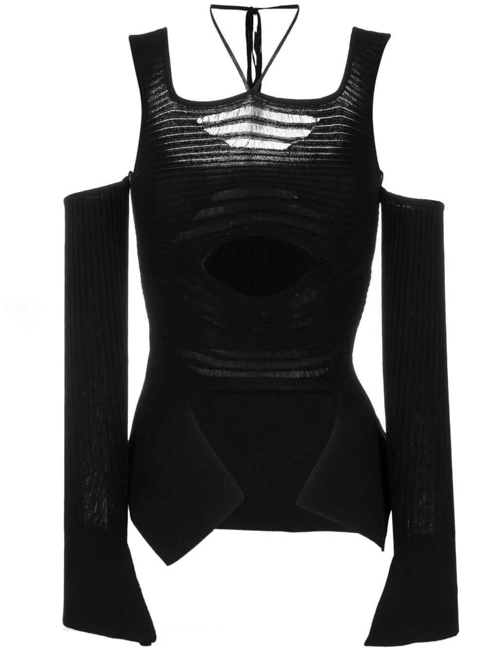 cut out-detail knitted top Highlights - Black - Knitted construction - Cut-out detailing - Halterneck tie fastening - Thin shoulder straps - Cold-shoulder design - Long sleeves - Flared cuffs - Asymmetric hem Made in Italy Composition Viscose 80%, Polyester 10%, Polyamide 9%, Elastane 1% SIZE & FIT Model measurements Height 5 ft 11 in(1.8 m) Bust/Chest 31.49 in(80 cm) Hips 36.22 in(92 cm) Waist 25.59 in(65 cm) FittingInformation Designed for a close fit throughout Made with a midweight knit, this piece offers some stretch This piece fits true to size – take your usual size Washing instructions Hand Wash