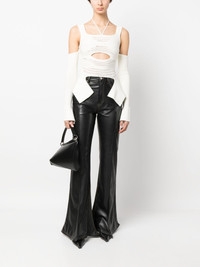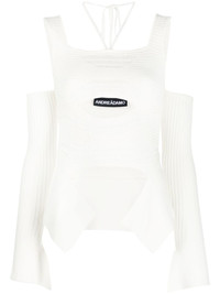 cut-out detail ribbed knit top ivory white ribbed knit distressed effect cut-out detailing wide shoulder straps crop sleeves halterneck tie fastening Made in Italy Composition Viscose 80%, Polyester 10%, Polyamide 9%, Elastane 1% SIZE & FIT Model measurements Height 5 ft 11 in(1.8 m) Bust/Chest 31.49 in(80 cm) Hips 35.43 in(90 cm) Waist 24.4 in(62 cm) FittingInformation Designed for a close fit throughout The tie fastening neckline offers a more secure fit allowing for adjustability Made with a midweight knit, this piece offers some stretch This piece fits true to size – take your usual size