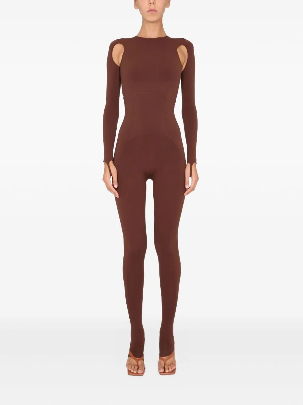 cut-out jumpsuit Highlights - Brown - Round open back - Long sleeves - Cut-out shoulders - Stirrup detail - Round neck Made in Italy Composition Polyamide 88%, Elastane 12% Washing instructions Read Manufacturer Guidelines