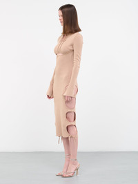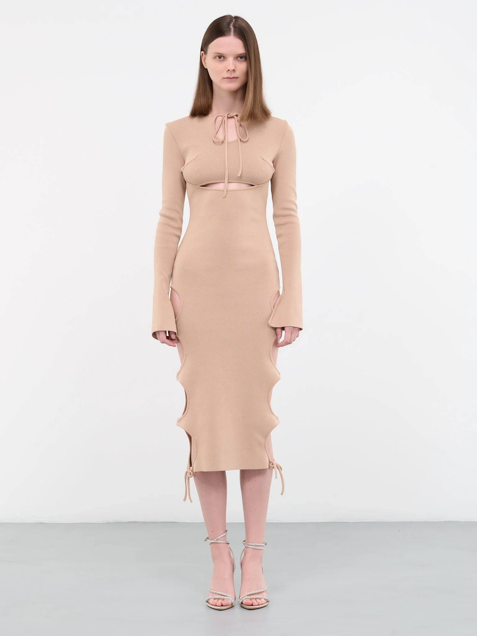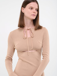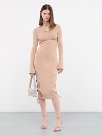 ANDREADAMO dress in beige, rib knit, cut-out & self-ties, elongated sleeves, flared cuffs, midi length, fitted. Standard Sizing Model is 5'10" wearing size S. Bust: 32" Waist: 24" Hips: 35"
