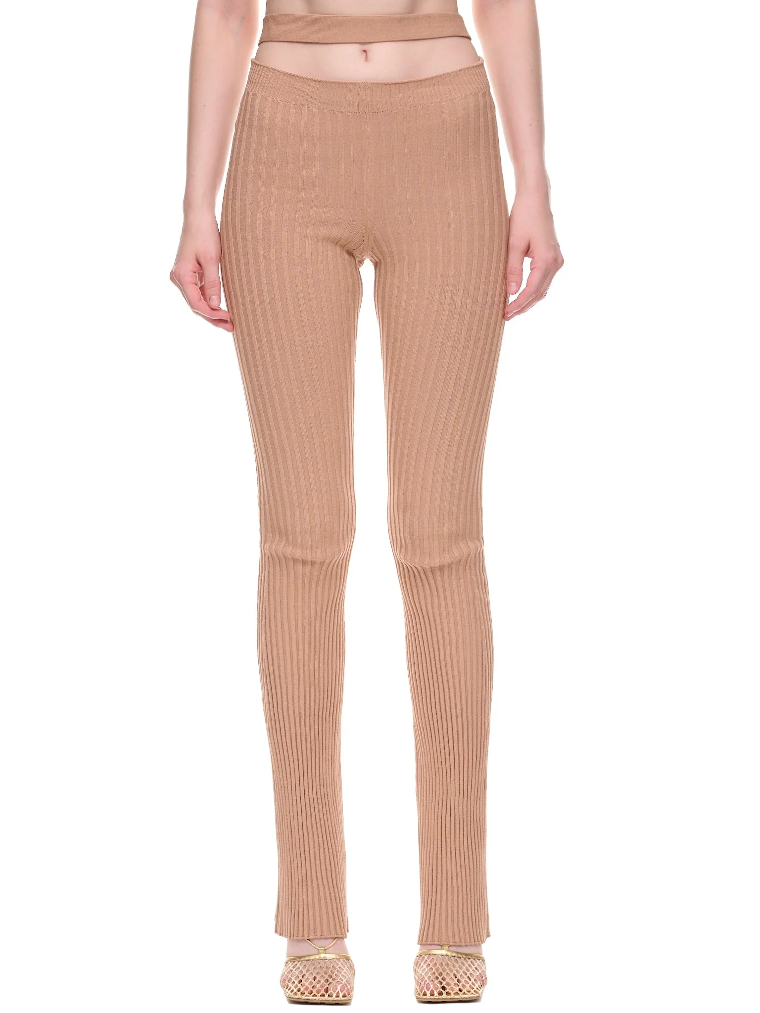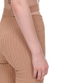 ANDREADAMO pants in nude, rib knit construction, stretch fabric, high-waist, cut-out detailing, elastic waistband, elongated length, flared hem, fitted. Made in Italy Standard Sizing 80% Viscose, 10% Polyester, 9% Polyamide, 1% Spandex Model is 5'9" wearing size XS. Bust: 32" Waist: 24" Hip: 34"