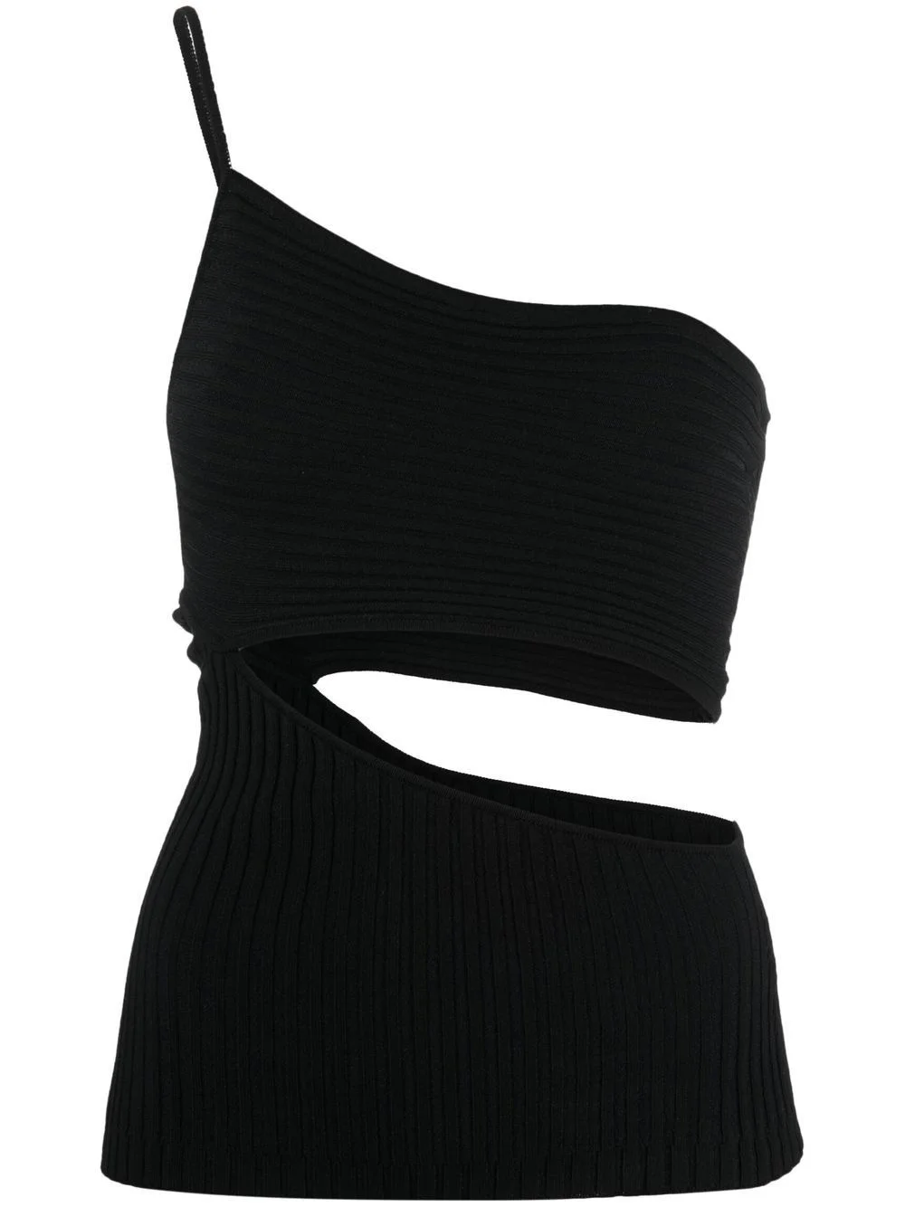 one-shoulder cut-out top black ribbed knit cut-out detailing one-shoulder spaghetti strap sleeveless straight hem Made In Italy Composition Viscose 80%, Polyester 10%, Polyamide 9%, Spandex/Elastane 1% SIZE & FIT Model measurements Height 5 ft 11 in(1.8 m) Bust/Chest 31.49 in(80 cm) Hips 36.22 in(92 cm) Waist 25.59 in(65 cm)