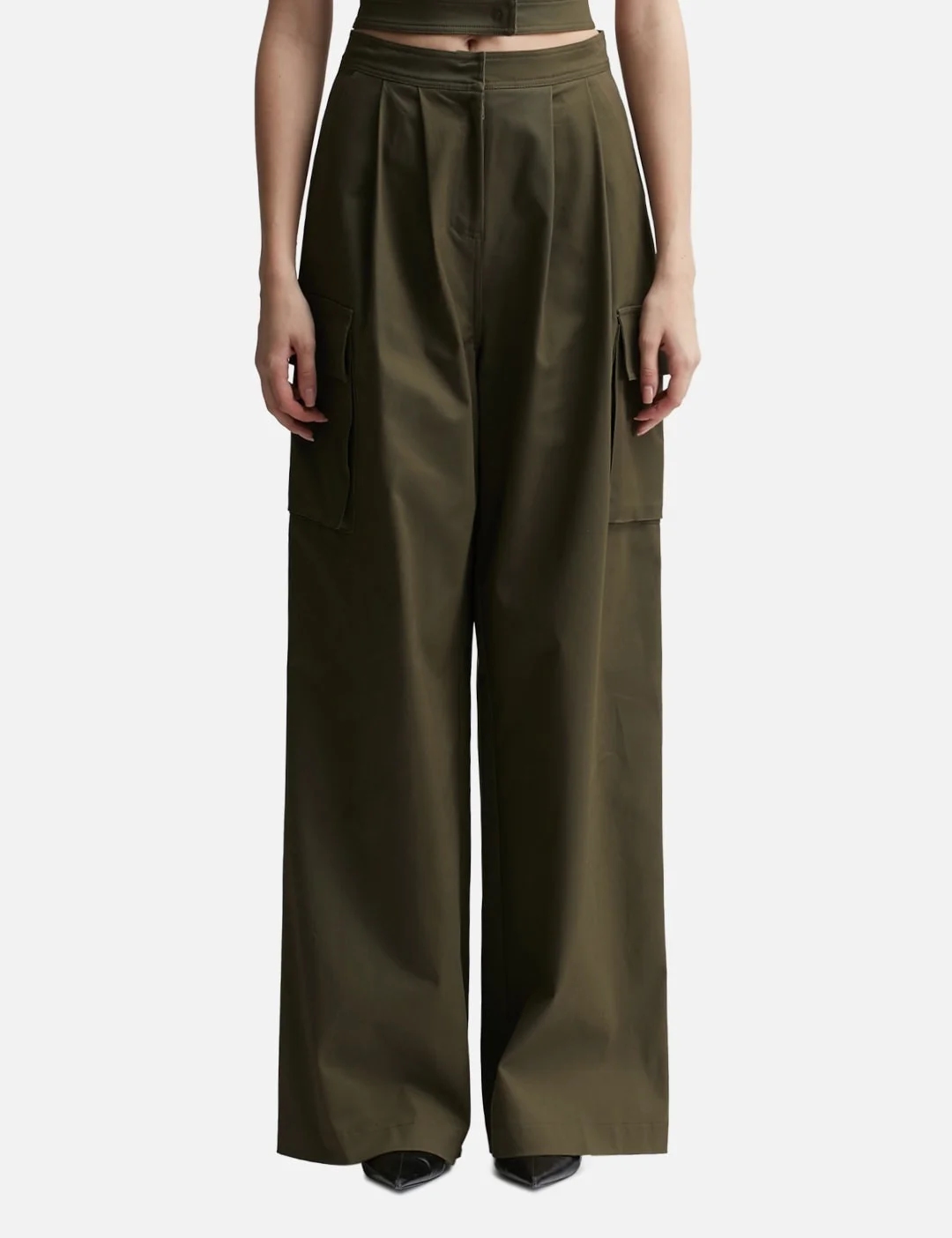 - ANDREĀDAMO - Pants With Double Belt - Made with stretchy cotton fabric - Cut-out belt - High-waisted - Front pleats - Hook and zip fly - Two side pockets - Two side cargo pockets - Two rear welt pockets - Wide leg - Color: Amazonia - Material: 98% Cotton , 2% Elastane - See more Pants and Clothing SIZING - Model wears size S - Model measures: Height 181cm, Chest 33”/84cm, Waist 24”/61cm, Hip 35”/90cm