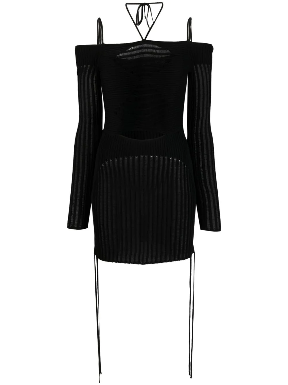 ribbed-knit mini dress black knitted construction ribbed knit cut-out detailing semi-sheer panels halterneck tie fastening square open back long sleeves bodycon design thigh-length straight hem Made in Italy Composition Viscose 80%, Polyester 10%, Polyamide 9%, Spandex/Elastane 1% SIZE & FIT Model measurements Height 5 ft 11 in(1.8 m) Bust/Chest 33.07 in(84 cm) Hips 37.4 in(95 cm) Waist 25.19 in(64 cm) FittingInformation This piece fits true to size. We recommend you get your regular size Cut for a close fit Made with a mid-weight stretch fabric