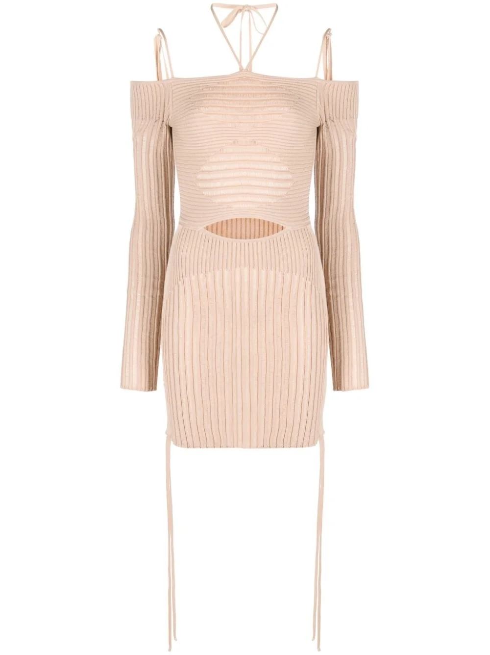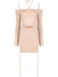 ribbed-knit mini dress blush beige knitted construction ribbed knit cut-out detailing semi-sheer panels halterneck tie fastening square open back long sleeves bodycon design thigh-length straight hem Made in Italy Composition Viscose 80%, Polyester 10%, Polyamide 9%, Spandex/Elastane 1% SIZE & FIT Model measurements Height 5 ft 11 in(1.8 m) Bust/Chest 33.07 in(84 cm) Hips 37.4 in(95 cm) Waist 25.19 in(64 cm) FittingInformation This piece fits true to size. We recommend you get your regular size Cut for a close fit Made with a mid-weight stretch fabric