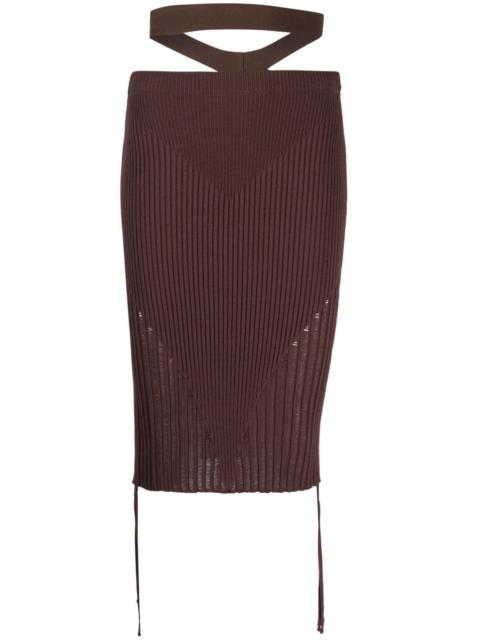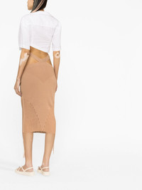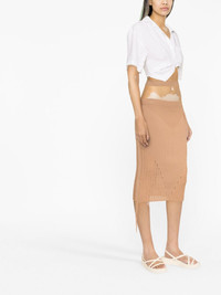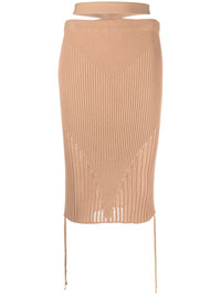 ribbed-knit pencil skirt Highlights - Almond beige - Knitted construction - Ribbed knit - Cut-out detailing - Straight hem - Knee-length Made in Italy Composition Viscose 80%, Polyester 10%, Polyamide 9%, Elastane 1% SIZE & FIT Model measurements Height 5 ft 10 in(1.77 m) Bust/Chest 32.67 in(83 cm) Hips 35.43 in(90 cm) Waist 23.62 in(60 cm) FittingInformation The tie fastening gives an adaptable and personalised fit Made with a midweight knit, this piece offers some stretch This piece fits true to size – take your usual size