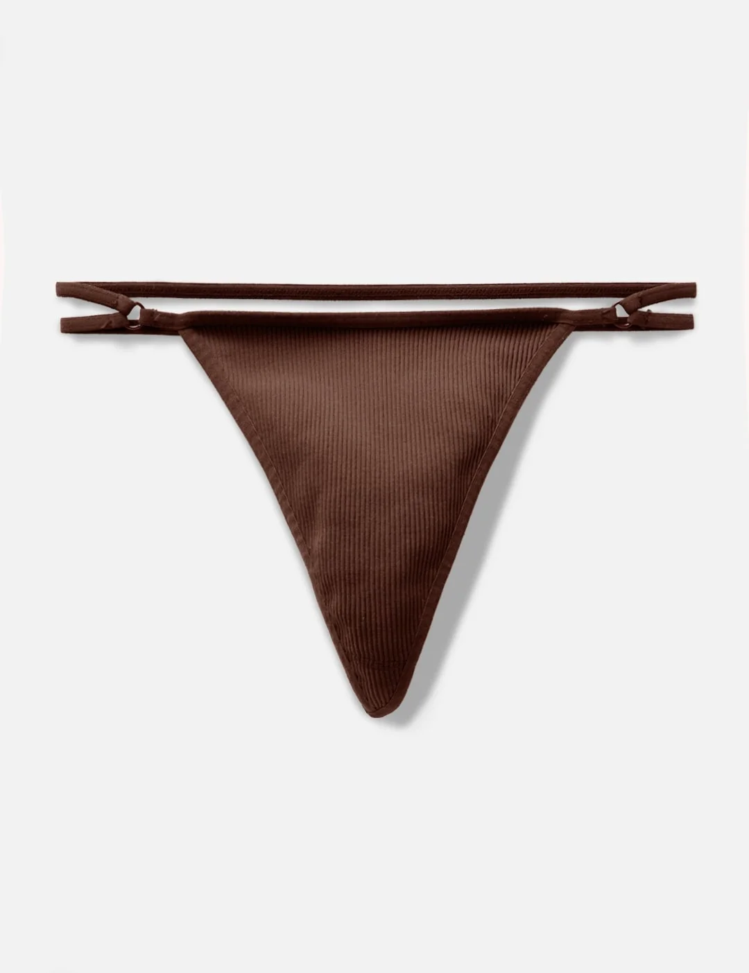 - ANDREĀDAMO - Ribbed Strap Detailed Thong - Stretch-design - Rib-knit construction - High cut thong design with branded double strap detailing - Color: Nude - Material: 94% Polyamide, 6% Elastane - See more Swimwear and Clothing SIZING - Model wears size S/M - Model measures: Height 181cm, Chest 33”/84cm, Waist 24”/61cm, Hip 35”/90cm