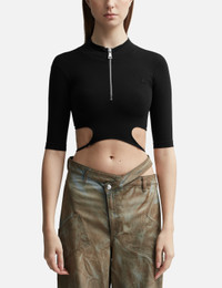 - ANDREĀDAMO - Sculpting Jersey Cut-out Top - Stretchy polyamide blended fabric - Cut-out detailing - Logo patch at the chest - Round neck - Front zip closure - Half-length sleeves - Cropped - Elastic waist strap - Color: Black - Material: 72% Polyamide , 28% Elastane - See more Tops and Clothing SIZING - Model wears size S/M - Model measures: Height 181cm, Chest 33”/84cm, Waist 24”/61cm, Hip 35”/90cm