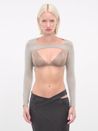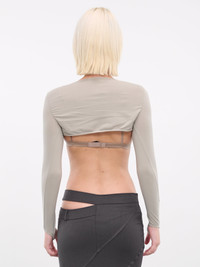 ANDREADAMO grey sleeves, shrug design, round neck, long sleeves, thumb holster, fitted. Standard Sizing Model is 5'9" wearing size XS. Bust: 32" Waist: 24" Hips: 34"