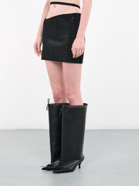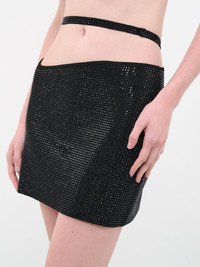 ANDREADAMO skirt in black, full strass, stretch knit, asymmetric waistline, velcro strap, mini length, slim fit. Standard Sizing Model is 5'10" wearing size S. Bust: 32" Waist: 24" Hips: 35"