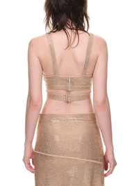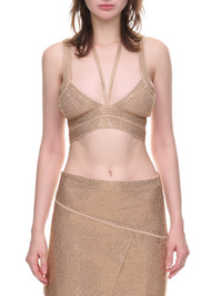 ANDREADAMO top in nude, bra design, knit construction, rhinestone embellished, halter neck, sleeveless, back hook eye & zip fastening, cropped, regular fit. Made in Italy Standard Sizing 44% Viscose, 43% Glass, 6% Polyester, 3% Aluminum Model is 5'9" wearing size XS. Bust: 32" Waist: 24" Hip: 34"