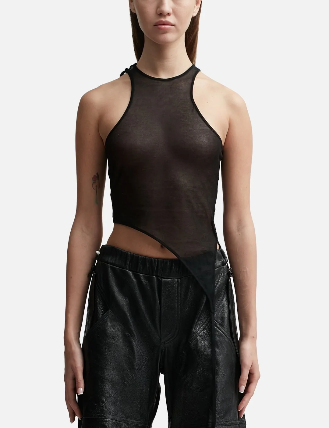 - ANDREĀDAMO - Transparent Knit Tank Top - Modal blend transparent fabric - Asymmetric hem - Tie closure - Color: Black - Material: Modal, Nylon, Silk - See more Tanks and Clothing SIZING - Model wears size S - Model measures: Height 175cm, Chest 33”/83.8cm, Waist 23”/58.4cm,Hip 34”/86.4cm