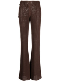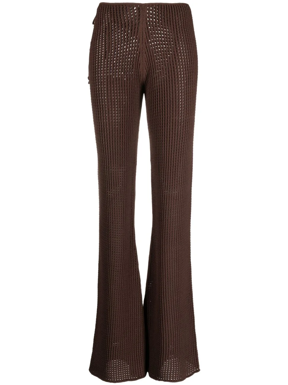 waffle-knit cut-out flared trousers These Andreadamo trousers re-define the notion of knitwear with their sheer, open waffle knit and self-tie hip cut outs. They hug figure before flaring out at the knee. Highlights - Brown - Knitted construction - Open knit - High waist - Cut-out detailing - Flared Made in Italy Composition Viscose 80%, Polyester 10%, Polyamide 9%, Elastane 1% SIZE & FIT Model measurements Height 5 ft 10 in(1.79 m) Bust/Chest 31.1 in(79 cm) Hips 35.03 in(89 cm) Waist 24.01 in(61 cm) FittingInformation The tie fastening gives an adaptable and personalised fit Made with a midweight knit, this piece offers some stretch This piece fits true to size – take your usual size Washing instructions Hand Wash