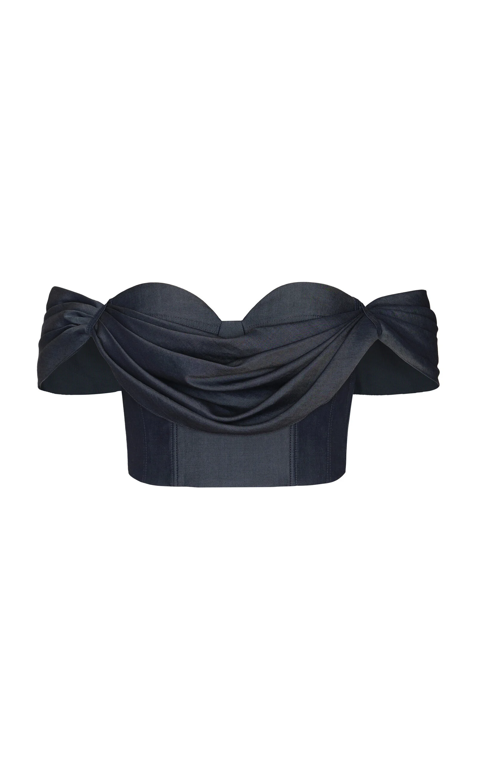 PRODUCT DETAILS - Off-the-shoulder, bustier bust, draped detail, fitted - Concealed zip fastening - Lined - Composition: 100% Tencel - Color: dark wash - Dry clean only - Pre-Fall '25