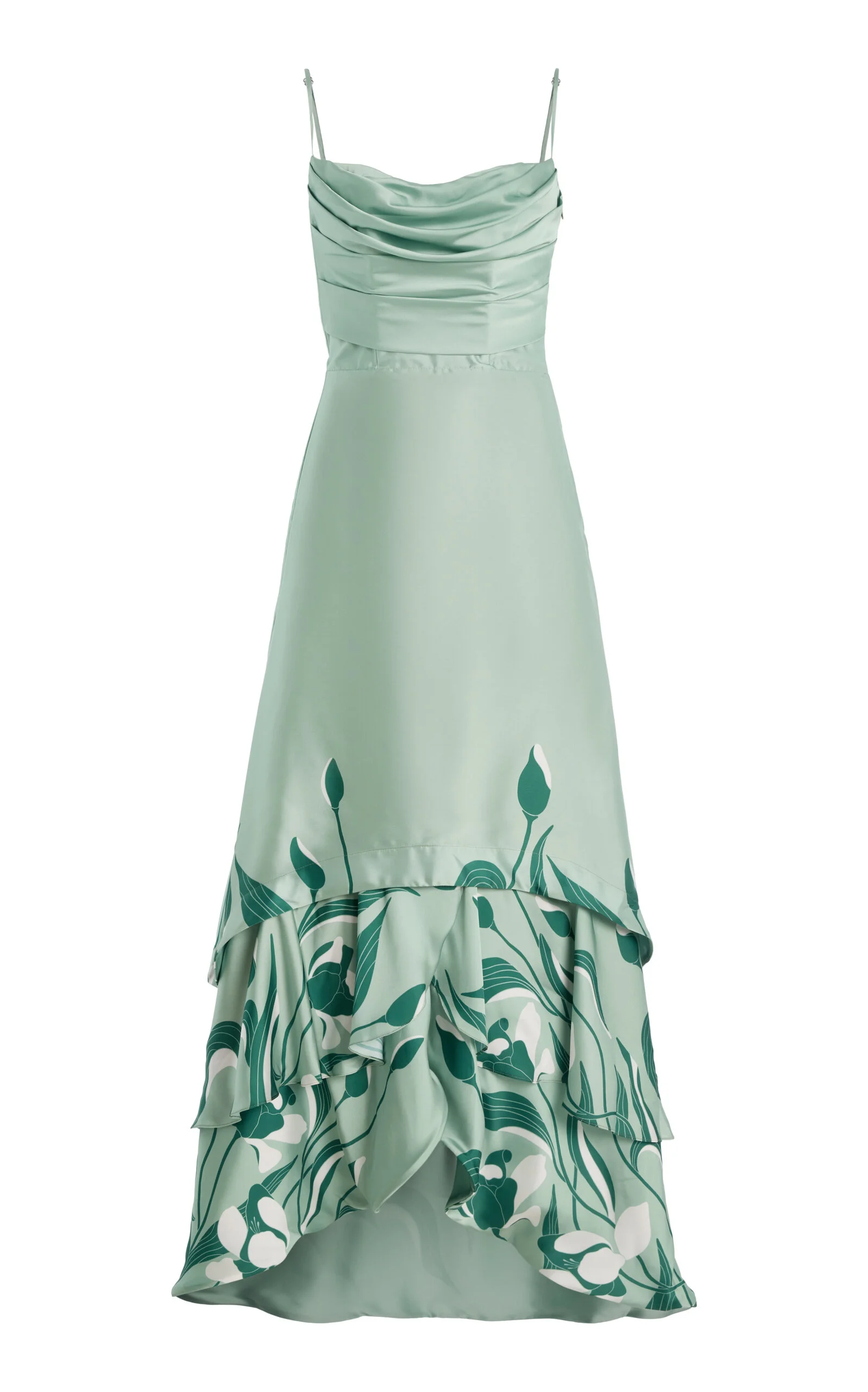 The Colombian designer draws inspiration from the lush, green landscapes of his home country’s tropical paradise. His goal? To mirror the vibrancy of the natural world through carefully designed pieces made from high-quality fabrics. Cut from tulip-printed satin, the 'Floreada' features a ruched bodice that falls to a tiered hem. PRODUCT DETAILS - Pre-Fall '25 - Zip fastening - Composition: 100% polyester - Designer color: Sage - Dry clean - Made in Colombia