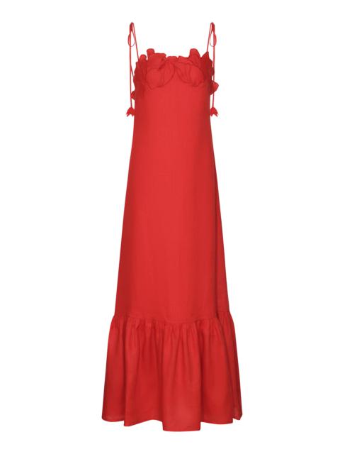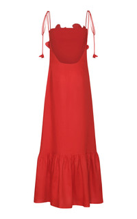 PRODUCT DETAILS - Slim tie straps, scalloped and embroidered bust, dropped tier, maxi hem - Concealed zip fastening - Lined - Composition: 100% Linen - Color: red - Dry clean only - Pre-Fall '25