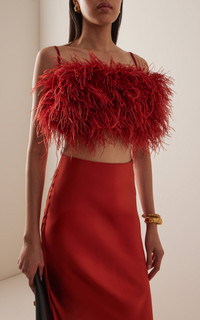 This Fall season, Andres Otalora celebrates the artistry of nature through a collection that blends craftsmanship and organic beauty. Inspired by the raw elegance of the natural world, this collection showcases hand-illustrated prints and shapes that embody the essence of authenticity. 'Prisma Etereo' has a bandeau silhouette made from cotton covered with floaty ostrich feathres. Pair it with the coordinating evening skirt from this season. PRODUCT DETAILS - Fall '25 - Zip fastening through back - Composition: 100% cotton; Trim: ostrich feathers - Designer color: Wine - Dry clean - Made in Colombia SIZE & FIT - Model is wearing a size 4