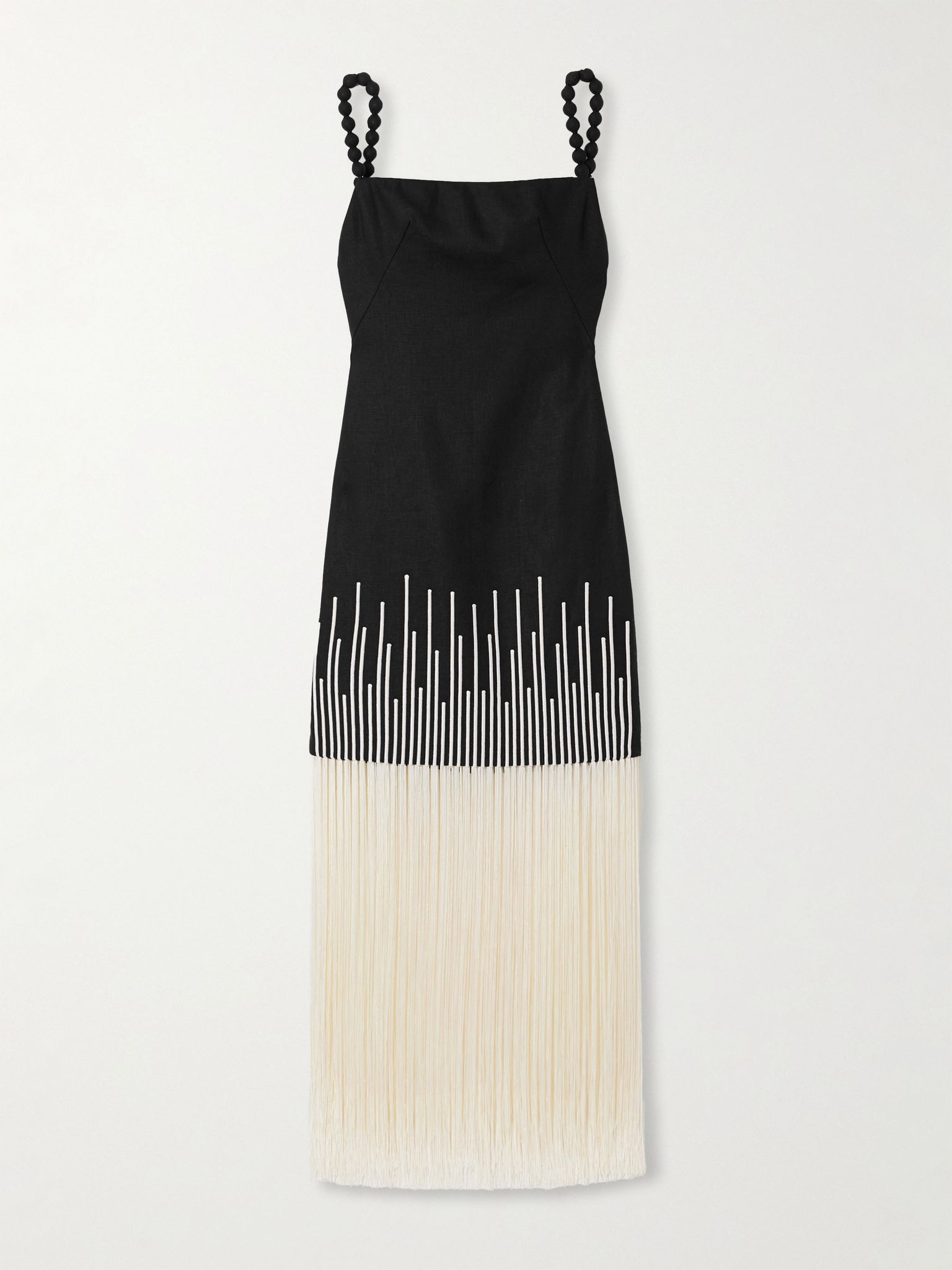 Andres Otalora draws from architecture to create sculptural designs defined by clean lines, structured shapes and beautiful movement. This midi dress is made from breathable linen embroidered in contrasting threads and has a swishy fringed hem. The spherical straps enhance the dimension. Size & Fit - Fits true to size, however those who are between sizes should take the smaller size - Intended for a slim fit - Mid-weight, non-stretchy fabric - Model is 180cm/ 5'11", normally wears a US 2 and is wearing a US 0 Model measurements: - Bust: 86cm/ 34" - Waist: 65cm/ 25.5" - Hip: 90cm/ 35.5" Details & Care - Black linen - Concealed hook and zip fastening at back - 100% linen - Dry clean