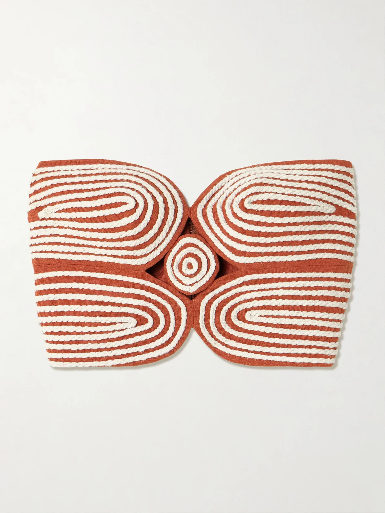 EXCLUSIVE AT NET-A-PORTER. Andres Otalora's Resort '25 collection is inspired by "the essence of a tropical landscape". This 'Baia' bustier top is made from panels of linen that create a cutout front and embroidered with swirling stripes. Complement the cropped hem with high-waisted styles.