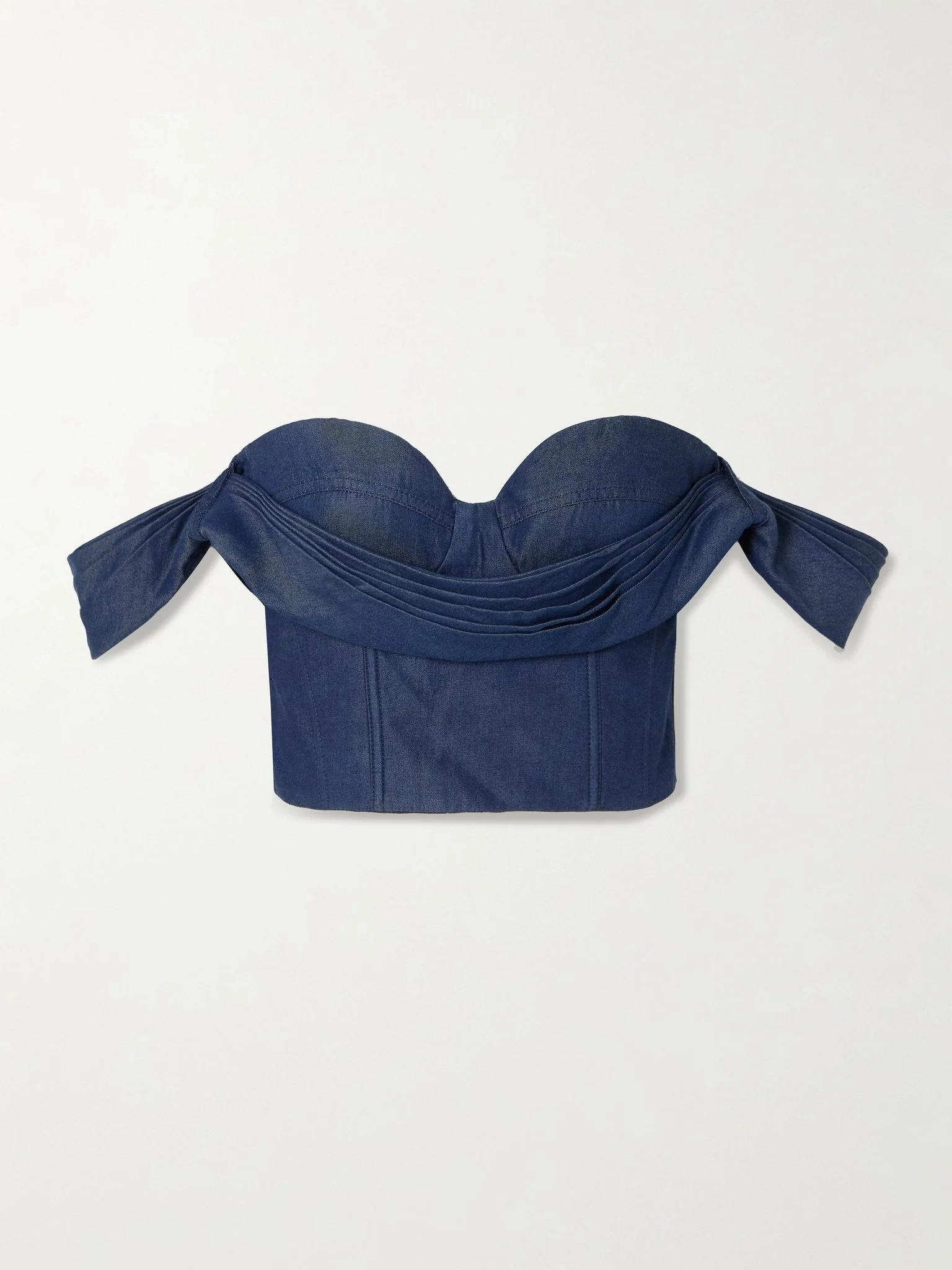 Andres Otalora's collections are heavily influenced by the designer's Colombian heritage and everything is made by a team of skilled local craftswomen. This 'De Azahar' bustier top is made from indigo TENCEL™ and detailed with draped pleats along the moulded cups and off-the-shoulder straps. Wear yours with the matching pants. Large to size. See Size & Fit notes. Lower-Impact Materials. This product is made using at least 50% lower-impact materials or ingredients. Responsible Craftsmanship. This product promotes artisanal skills and a brand that invests in communities and adheres to fair-trade principles. Find out more about our NET SUSTAIN criteria here. Size & Fit - Fits large to size, take one size smaller than normal - Designed for a close fit - Mid-weight, non-stretchy fabric - Model is 180cm/ 5'11" and is wearing a size XSmall Model measurements: - Bust: 80cm/ 31.5" - Waist: 65cm/ 25.5" - Hip: 89cm/ 35" Details & Care - Indigo TENCEL™ - Zip fastening along side - 100% TENCEL™; lining: 100% viscose - Fully lined - Dry clean