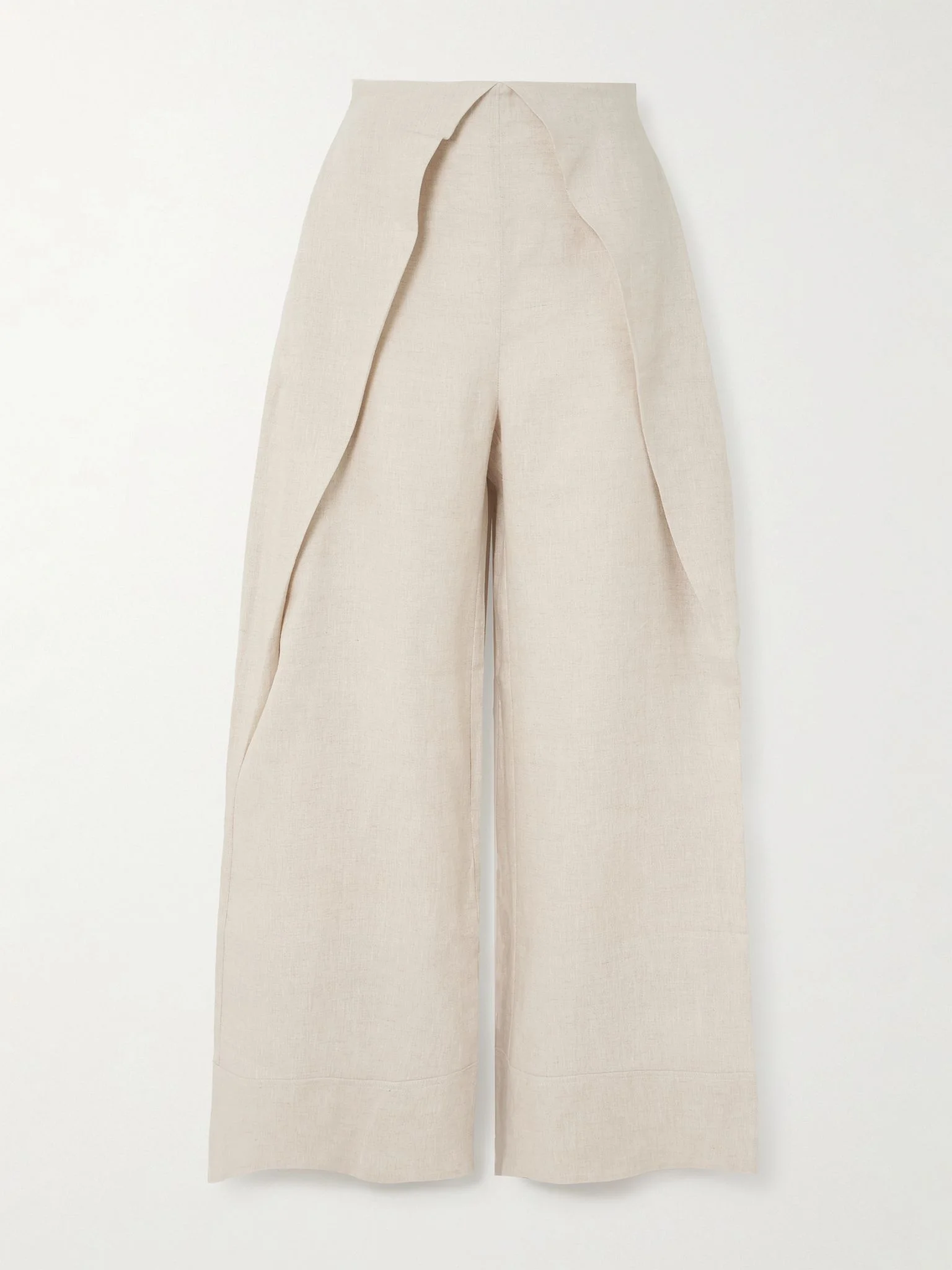 There's a sophisticated ease to Andres Otalora's 'De Estaciones' pants. Traditionally handmade in Cali, Colombia, they're tailored from certified linen with an overlay draped from the waist. Style yours with a loose shirt or the coordinating top. Lower-Impact Materials. This product is made using at least 50% lower-impact materials or ingredients. Responsible Craftsmanship. This product promotes artisanal skills and a brand that invests in communities and adheres to fair-trade principles. Find out more about our NET SUSTAIN criteria here. Size & Fit - Fits true to size, take your normal size - High-rise, cut for a wide-leg fit - Mid-weight, non-stretchy fabric - Model is 180cm/ 5'11" and is wearing a US 2 Model measurements: - Bust: 80cm/ 31.5" - Waist: 65cm/ 25.5" - Hip: 89cm/ 35" Details & Care - Beige linen - Concealed hook and zip fastening at back - 100% linen - Unlined - Dry clean - Designer color: Oatmeal