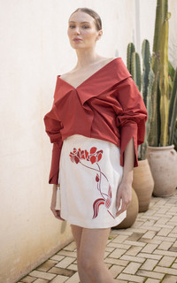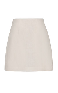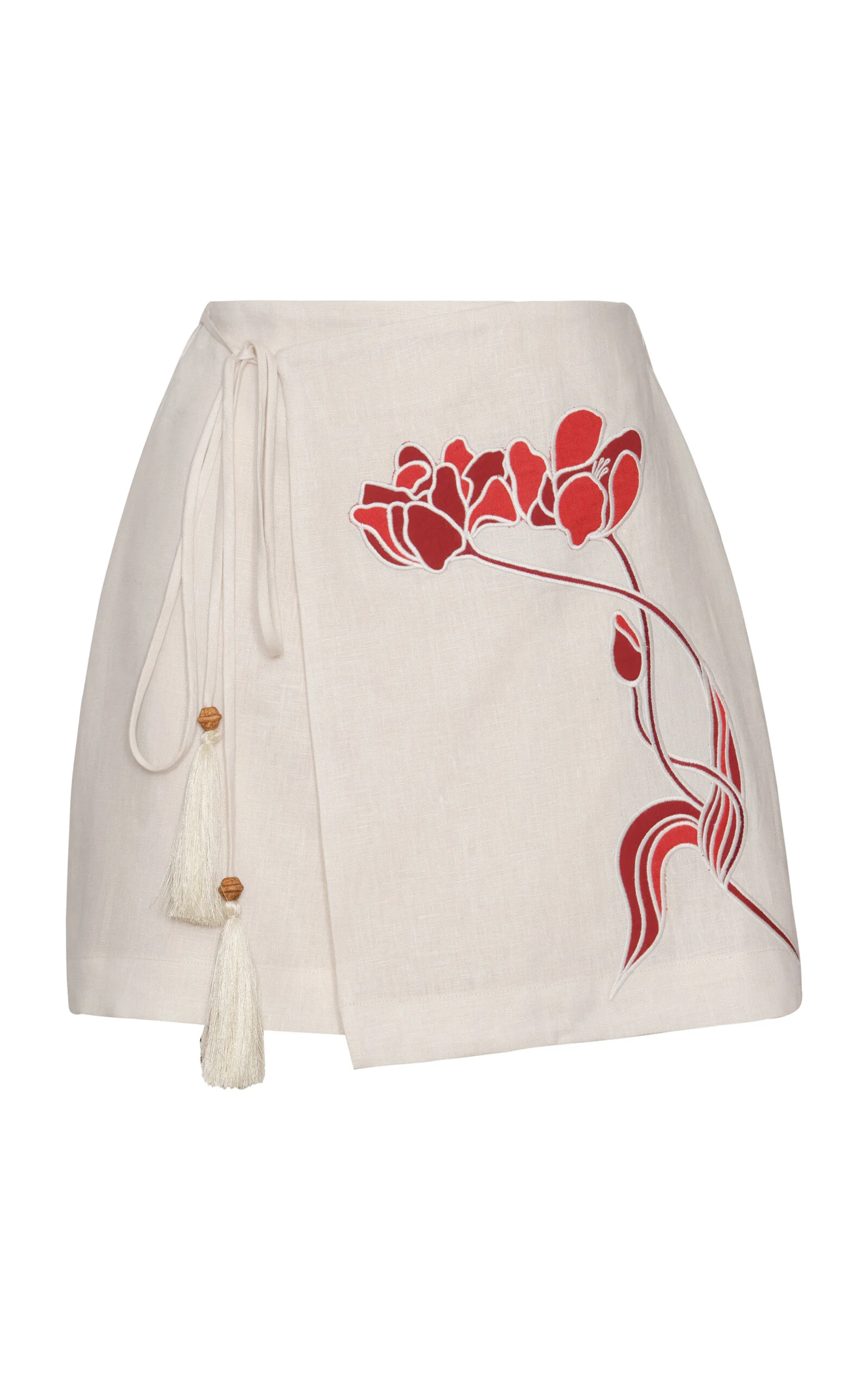 PRODUCT DETAILS - High-waisted, A-line, wrapped design, embroidered, mini hem - Tie fastening - Lined - Composition: 100% Linen - Color: off-white - Dry clean only - Pre-Fall '25