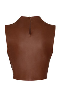 This Fall season, Andres Otalora celebrates the artistry of nature through a collection that blends craftsmanship and organic beauty. Inspired by the raw elegance of the natural world, this collection showcases hand-illustrated prints and shapes that embody the essence of authenticity. 'Recuerdame' is a cropped mock-neck top made from smooth leather gathered to drape over the body. The ties at the side hem give it a wrapped effect. PRODUCT DETAILS - Fall '25 - Button fastening at back - Composition: 100% leather - Specialist clean - Made in Colombia