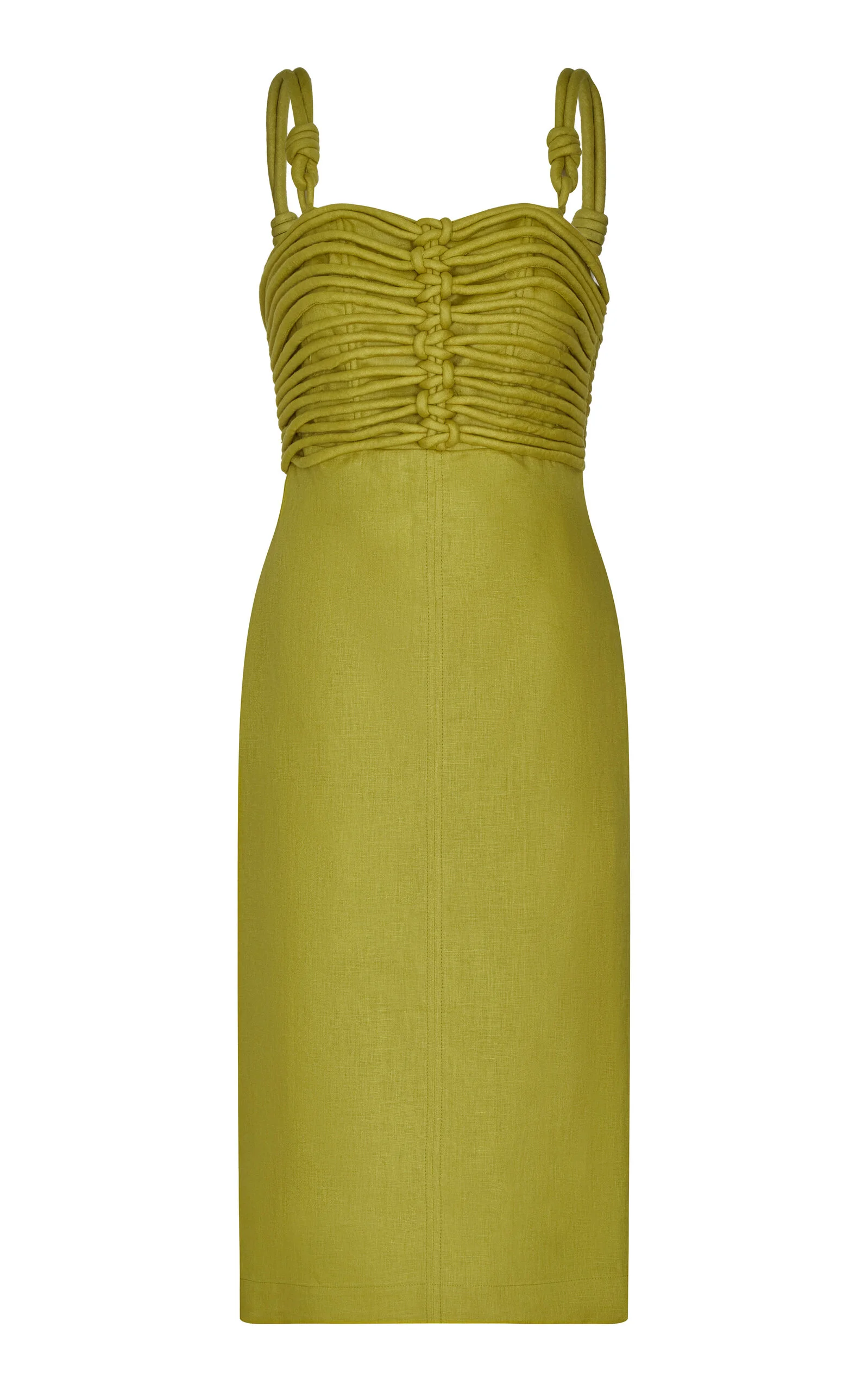 PRODUCT DETAILS - Slim fit, sleeveless, shoulder straps, sweetheart neck, braided detail - Zipper fastening - Lined - Composition: 100% Linen - Color: lime green - Dry Clean Only - Resort '26