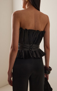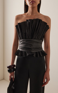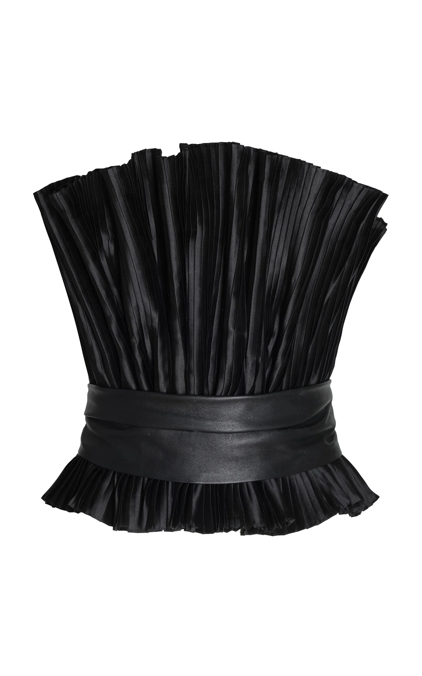 This Fall season, Andres Otalora celebrates the artistry of nature through a collection that blends craftsmanship and organic beauty. Inspired by the raw elegance of the natural world, this collection showcases hand-illustrated prints and shapes that embody the essence of authenticity. Cut from plisse satin-faced silk organza, the 'Senda Perenne' top features a leather belt that creates a fanned silhouette. PRODUCT DETAILS - Fall '25 - Button fastenings at back - Composition: 100% silk; Belt: 100% leather - Dry clean - Made in Colombia SIZE & FIT - Model is wearing a size 4
