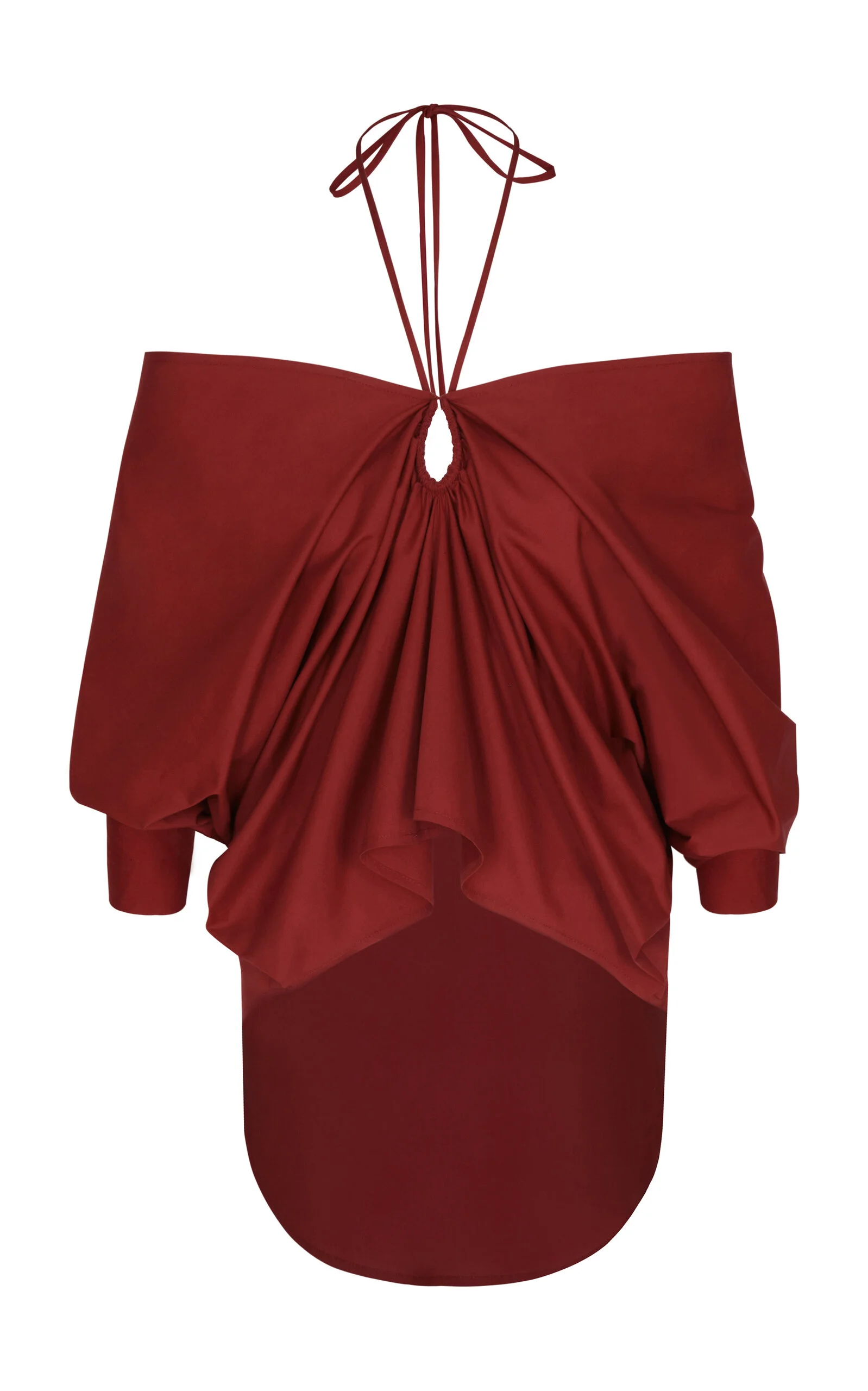 PRODUCT DETAILS - Slim fit, 3/4-length off-the-shoulder sleeves, halter neck, gathering - Slips on - Lined - Composition: 100% Cotton - Color: red - Dry Clean Only - Resort '26