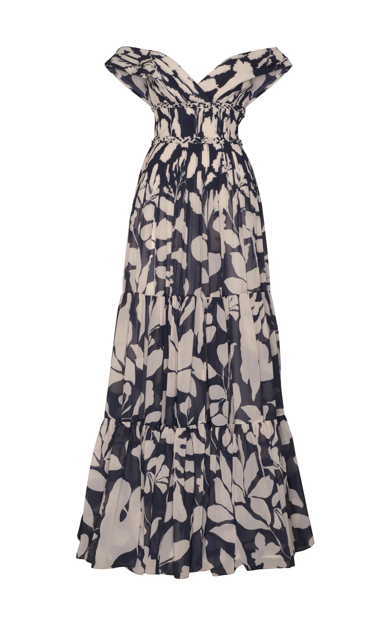 PRODUCT DETAILS - Resort '25 - Slim fit, A-line silhouette, gathered bodice, off-the-shoulder portrait neckline, sleeveless, braided details, tiered flared skirt - Lined - Composition: 100% Recycled Polyester Chiffon - Concealed zip fastening along back - *Dry clean - Made in Colombia