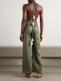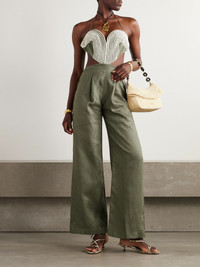 Andres Otalora's collections are meticulously made in its Colombian atelier by a team of over 50 skilled local craftswomen. Designed to look like two perfectly paired separates, this 'Zinnia' jumpsuit is made from certified linen and has an intricately embroidered bodice and loose, breezy pants. The slim ties are tipped with playful tassels, while the waist is partially elasticated for optimal comfort. Lower-Impact Materials. This product is made using at least 50% lower-impact materials or ingredients. Responsible Craftsmanship. This product promotes artisanal skills and a brand that invests in communities and adheres to fair-trade principles. Find out more about our NET SUSTAIN criteria here. Size & Fit - Fits true to size, however those who are between sizes should take the smaller size - Designed to be fitted at the bust and waist with wide-leg pants - Ties at the back for an adjustable fit - Lightweight, non-stretchy fabric - Model is 177cm/ 5'10" and is wearing a US 0 Model measurements: - Bust: 80cm/ 31.5" - Waist: 60cm/ 23.5" - Hip: 89cm/ 35" Details & Care - Green linen - Ties at neck and back; concealed zip fastening along side - 100% linen - Unlined - Dry clean