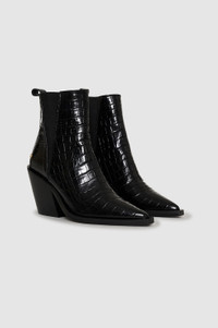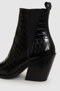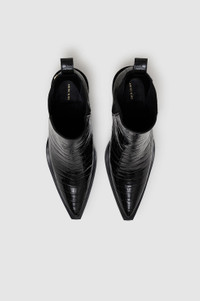 The Bekah Boots are crafted from shiny 100% leather stamped with faux croco-embossed texture. This statement pair features a subtle pointed toe framed by a sharp square-shaped outsole, slanted cuban heel, elastic gores, and back pull tabs. Complete with a cushioned insole and accented with gold-tone ANINE BING hardware at each heel. True to size. If you are between sizes, we recommend taking the next size up. FIT + MEASUREMENTS True to size. If you are between sizes, we recommend taking the next size up. Model is wearing a size 40. Model Measurements: Height: 5'10.5", Bust: 31", Waist: 24", Hips: 34" Product Measurements (Size 37): Sole Length: 9.3", Sole Width: 2.6", Heel Height: 3.5", Shoe Height: 5.3" MATERIAL + CARE 100% Cow Leather Spot clean Made in Portugal