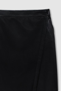 A sleek midi skirt cut from recycled leather, featuring a subtly asymmetrical design for a modern edge. FIT + MEASUREMENTS Model is wearing a size S. Model Measurements: Height: 5'9", Bust: 30", Waist: 23, Hips: 33" Product Measurements (Size S): Length: 17.5", Waist: 22.5", Hip: 32.5" MATERIAL + CARE 48% Leather, 25% Polyester, 27% Polyurethane Hand wash separately Made in China