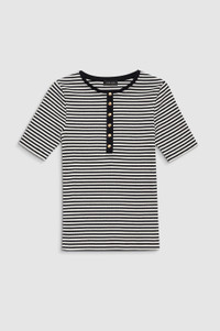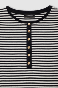 A modern, Henley-inspired tee made from a heavyweight cotton-spandex blend with an all-over ribbed texture and a soft hand. This elevated basic features a high crew neckline and gold monogram snap buttons along the front placket. The Alessia Tee is cut for a relaxed fit. Take your true size. FIT + MEASUREMENTS The Alessia Tee is cut for a relaxed fit. Take your true size. Model is wearing a size S. Model Measurements: Height: 5'9.5", Bust: 29.5", Waist: 23", Hips: 34.5" Product Measurements (Size S): Length: 23.3", Bust: 13.5", Sleeve Length: 9.4" MATERIAL + CARE 95% Cotton, 5% Spandex Machine wash Made in Turkiye