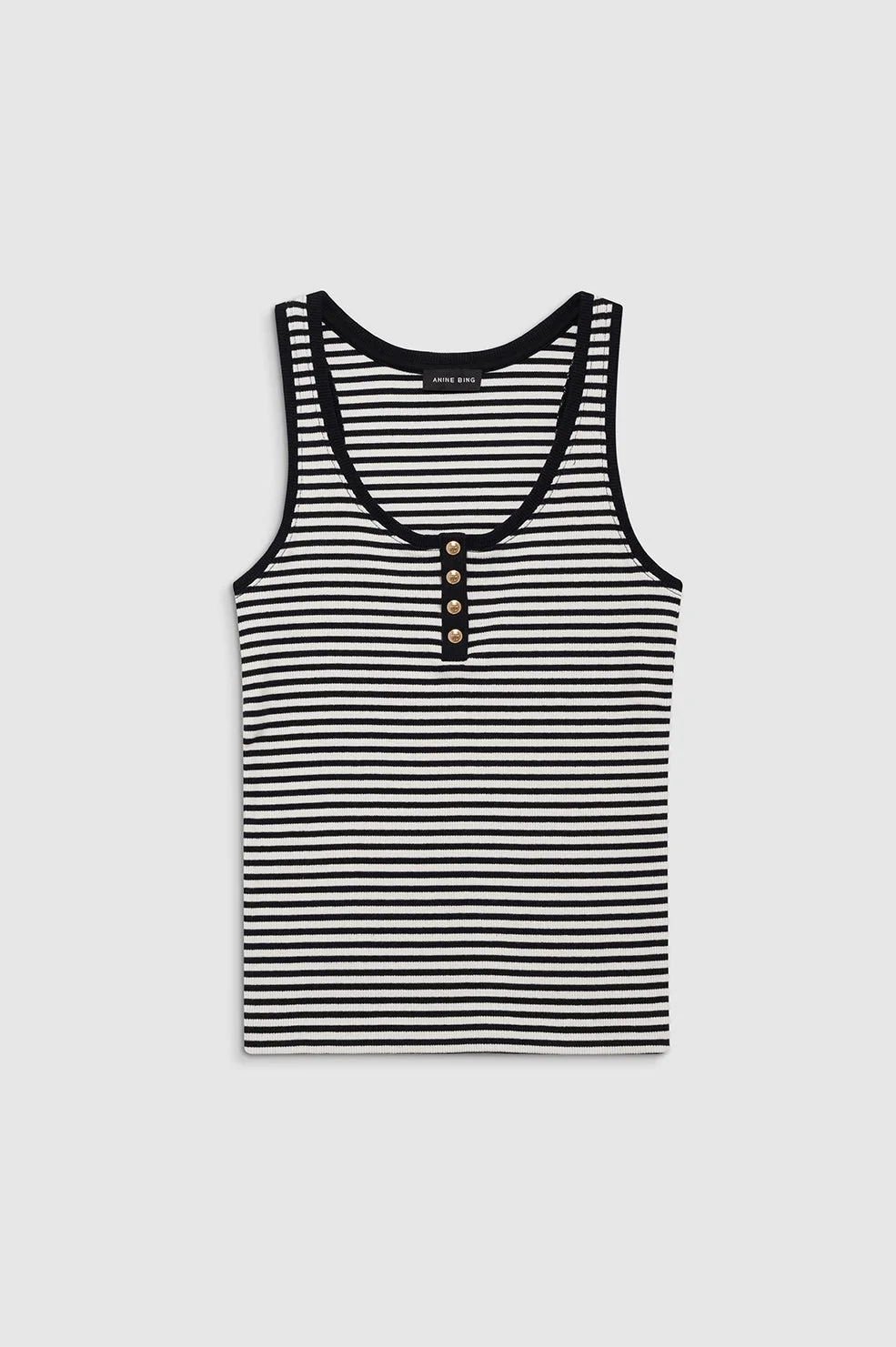 A modern, Henley-inspired tank top made from a heavyweight cotton-spandex blend with an all-over ribbed texture and a soft hand. This elevated basic features a round neckline and gold monogram snap buttons along the front placket. The Alessia Tank is cut for a relaxed fit. Take your true size. FIT + MEASUREMENTS The Alessia Tank is cut for a relaxed fit. Take your true size. Model is wearing a size S. Model Measurements: Height: 5'9.5", Bust: 29.5", Waist: 23", Hips: 34.5" Product Measurements (Size S): Length: 23.3", Bust: 13.5" MATERIAL + CARE 95% Cotton, 5% Spandex Machine wash Made in Turkiye