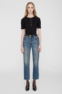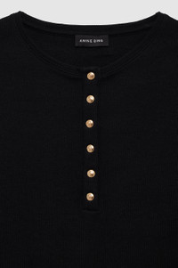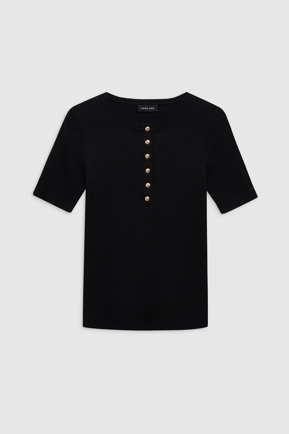 A modern, Henley-inspired tee made from a dense cotton-spandex blend with an all-over ribbed texture and a soft hand. This elevated basic features a high crew neckline and gold monogram snap buttons along the front placket. The Alessia Tee is cut for a relaxed fit. Take your true size. FIT + MEASUREMENTS The Alessia Tee is cut for a relaxed fit. Take your true size. Model is wearing a size S. Model Measurements: Height 5′10", Bust 32", Waist 24", Hips 35" Product Measurements (Size S): Length: 23.3", Bust: 13.5", Sleeve Length: 9.4" MATERIAL + CARE 95% Cotton, 5% Spandex Machine wash Made in Turkey