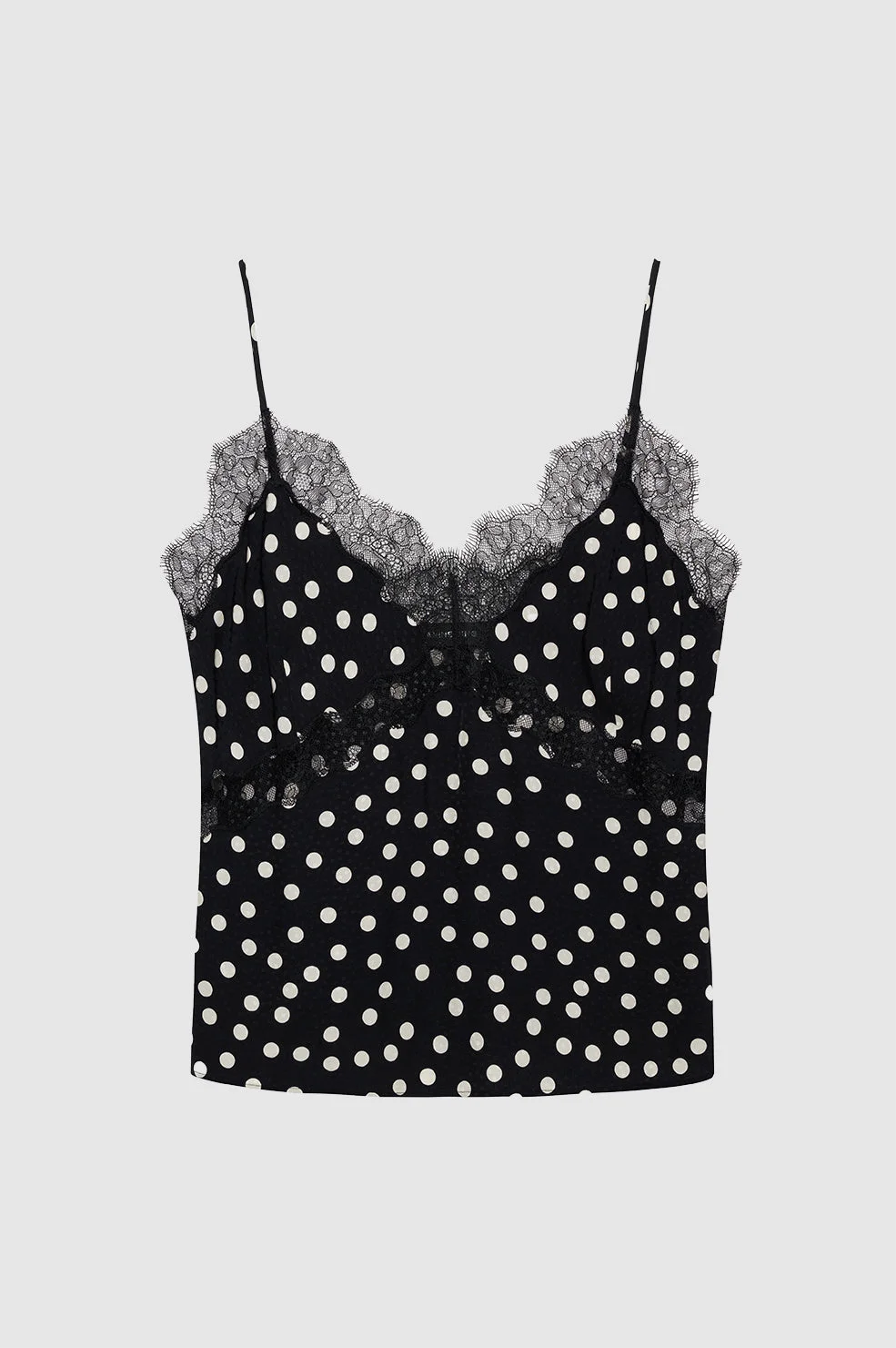 The Amelie Camisole is a day-to-night piece crafted from a lightweight, double-dot jacquard fabric with lace trimming at the top. - Deep V-neckline - Thin spaghetti straps FIT + MEASUREMENTS Model is wearing a size S. Model Measurements: Height: 5'9", Bust: 30", Waist: 23", Hips: 34" Product Measurements (Size S): Length: 17.6", Bust: 36" MATERIAL + CARE 100% Viscose Made in China
